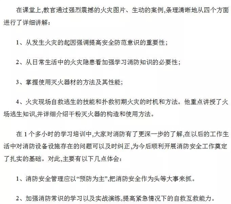 为了增强我公司人员对消防安全工作的认识,提高防范意识,做到让大家熟悉掌握消防技巧,6月24 日,公司邀请了消防宣传中心的教官,举行了消防安全知识讲座。全体员工参加了此次培训。